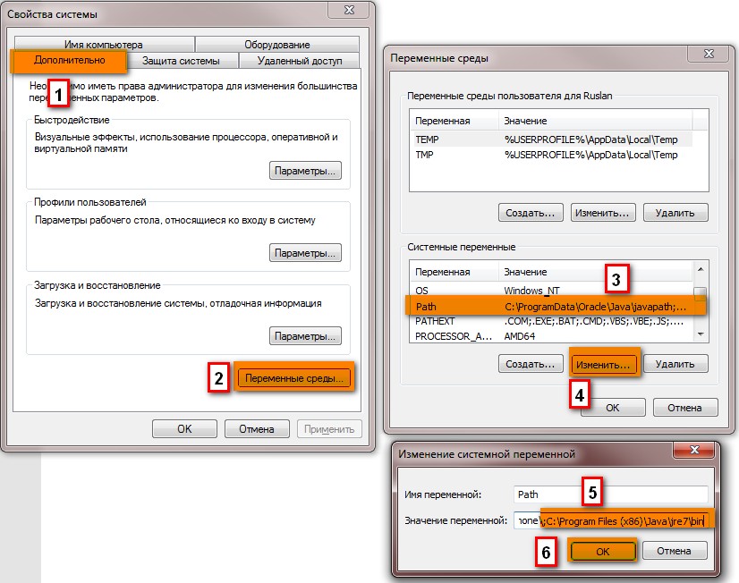2. Перейдите во вкладку "Дополнительно", нажмите "Переменные среды", в списке системных переменных выберите "Path", нажмите "Изменить", в значении переменной добавьте через точку с запятой путь до директории "bin" в каталоге, где у вас установлена актуальная версия Java (в зависимости от установленной версии Java путь может быть различным; на приведенном ниже скриншоте это C:\Program Files (x86)\Java\jre7\bin), и нажмите "Ок":