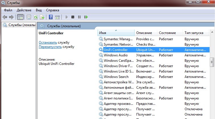 5. Откройте оснастку управления службами (команда services.msc) и удостоверьтесь, что служба UniFi Contoller присутствует в списке и ей присвоен необходимый тип запуска:
