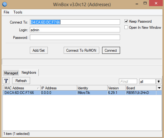3. Запускаем WinBox. В нижней секции во вкладке Neighbors, даже при отсутствии соединения с роутером по IP, его будет видно по MAC-адресу: