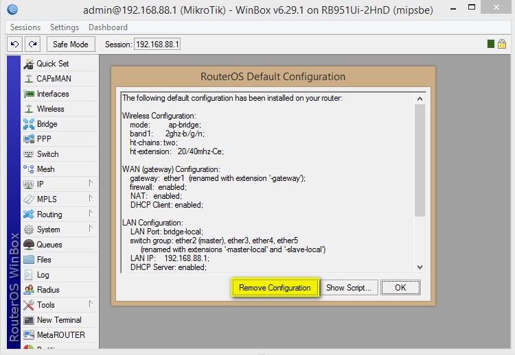 4. После входа в устройство, нам откроется окошко RouterOS Default Configuration. Удаляем конфигурацию по умолчанию, нажав на Remove Configuration:
