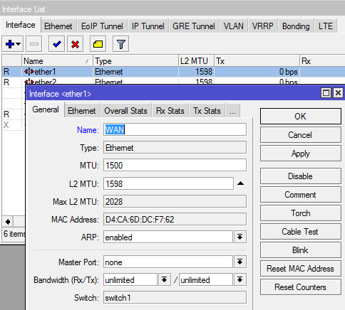 2. По умолчанию все проводные сетевые интерфейсы в Mikrotik называются etherN. Оперировать такими названиями неудобно, поэтому откроем интерфейс ether1, к которому у нас подключен кабель провайдера, и переименуем его в WAN. В принципе, делать это необязательно - название ни на что не влияет. Но зато сильно упрощает администрирование роутера в будущем.