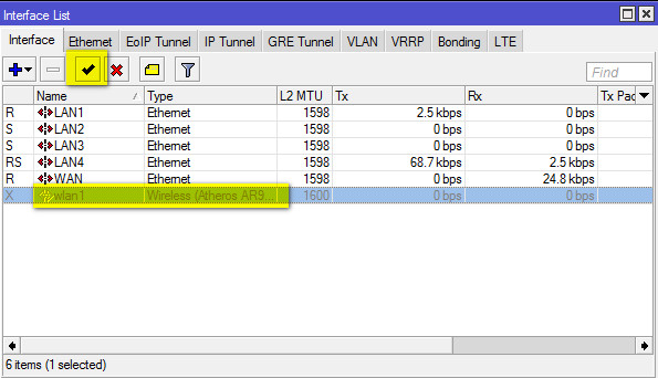1. Теперь настроим Wi-Fi. Напомним, что в п. 4-5 раздела "Настройка сетевых интерфейсов в Mikrotik RB951Ui-2HnD", мы уже включили беспроводной интерфейс и присвоили ему новое название.
