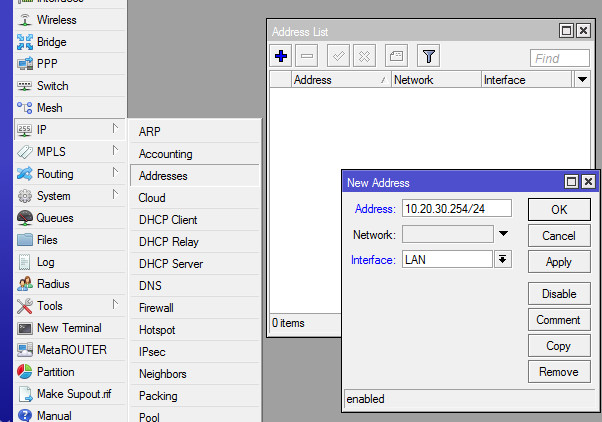1. Присвоим роутеру IP-адрес. В нашем примере это будет 10.20.30.254 с маской 255.255.255.0 (или /24; вообще запись /24 эквивалентна записи /255.255.255.0, RouterOS понимает оба варианта. Подробности бесклассовой адресации можно выяснить здесь: https://ru.wikipedia.org/wiki/Бесклассовая_адресация). Для этого в меню IP -> Addresses добавим новый адрес и присвоим его интерфейсу LAN (ранее созданный мост):