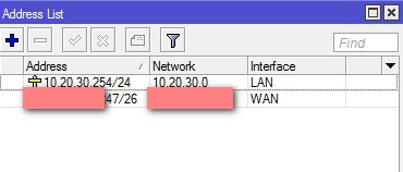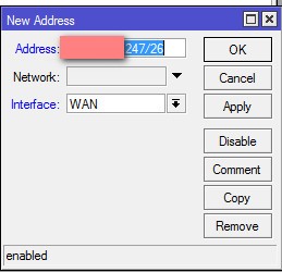 2. Присвоим внешнему интерфейсу роутера IP-адрес. В данном примере мы рассматриваем сценарий, когда провайдер Интернет предоставляет нам прямой доступ в сеть с белым IP-адресом. Для этого снова жмем на + в меню IP -> Addresses, вводим выданный провайдером адрес и маску, а в качестве интерфейса выбираем WAN: