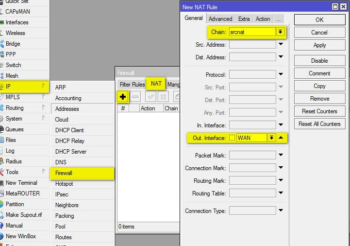 1. Настраиваем NAT. В меню IP -> Addresses во вкладке NAT жмем +. Во вкладке General параметр Chain ставим в положение scrnat, Out. Interface - в WAN: