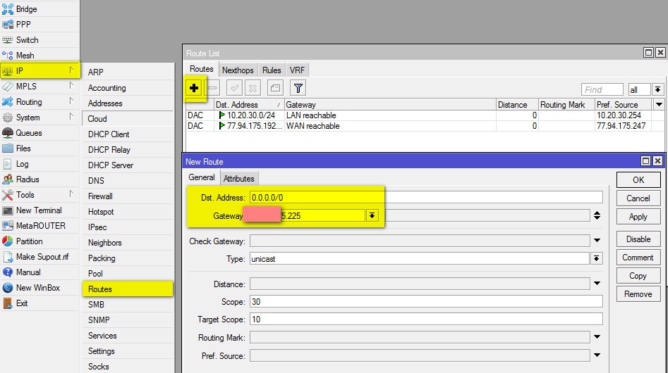 5. Укажем шлюз провайдера Интернета. Для этого создадим в меню IP -> Routes новый маршрут, нажав +, присвоим параметр Dst. Address - 0.0.0.0/0, Gateway - выданный нам провайдером: