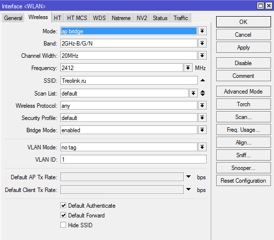 2. Теперь открываем интерфейс WLAN, переходим во вкладку Wireless, выбираем Mode - ap bridge, Band - 2GHz-B/G/N, вводим SSID - название беспроводной сети: