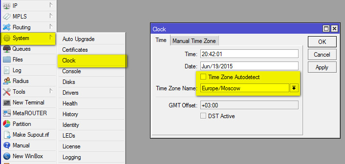 1. Мы на финишной прямой. Настроим часовой пояс через System -> Clock, где снимем автоопределение часового пояса - Time Zone Autodetect, и выберем нужный часовой пояс (в нашем случае - Europe/Moscow):