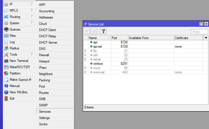 3. И, наконец, отключим ненужные сервисы для доступа, дабы сделать наш Mikrotik менее уязвимым. Лишними можно считать все сервисы, кроме WinBox, но в данном случае следует исходить из вашей конкретной ситуации. Их список находится в IP -> Services. Нужные оставляем, ненужные выключаем крестиком: