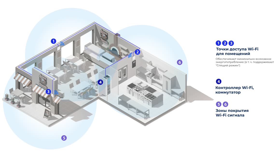 Wi-Fi в ресторанах и кафе — сервис, обеспечивающий как качественный доступ в Интернет гостям, так и доступ к сетевым ресурсам и сервисам сотрудникам предприятия. С помощью Wi-Fi можно организовать электронное меню, видео- и аудиовещание, передачу заказов от официантов на кухню, видеонаблюдение, телефонию. Доступ в Интернет для посетителей может и должен быть организован в соответствии с законодательством в части идентификации пользователей. Бесшовный Wi-Fi (т.е. когда при переходе из зоны действия одной точки доступа в зону действия другой подключенное к сети устройство не теряет связь) на предприятии общественного питания позволяет реализовать прозрачный доступ пользователей на всей территории: в банкетном зале, фойе, на улице, парковке и т. д. Для сотрудников предприятия это также означает возможность осуществлять свободное перемещение по территории, сохраняя при этом свою функциональность.