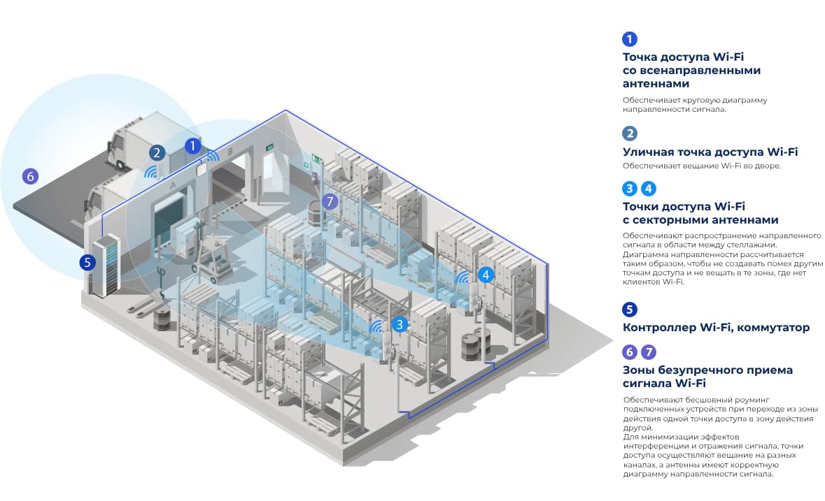 Wi-Fi на складах — инфраструктурный сервис, обеспечивающий беспроводную связь для терминалов сбора данных (ТСД), телефонов, терминалов RFID, беспроводных сенсоров и датчиков, компонентов систем видеонаблюдения, автопогрузчиков и т. д. Современная специфика работы склада предусматривает постоянное движение грузов, до нескольких десятков тысяч перемещений в сутки. Автоматизация и беспроводная связь в таких условиях — элементы первой необходимости для бизнеса, позволяющие создать интегрированную систему управления складом и контролировать его в режиме реального времени. Автоматизированный склад обеспечивает экспоненциальное увеличение количества обработанных в единицу времени заказов, минимизирует время пребывания товара на складе и практически исключает потерю или порчу продукции. Для сотрудников склада бесшовная сеть Wi-Fi обеспечивает возможность пользоваться корпоративным IP-телефоном, портативным принтером, сканером RFID, терминалом, на который поступают задачи по сборке и транспортировке грузов, оставаясь при этом полностью мобильными.