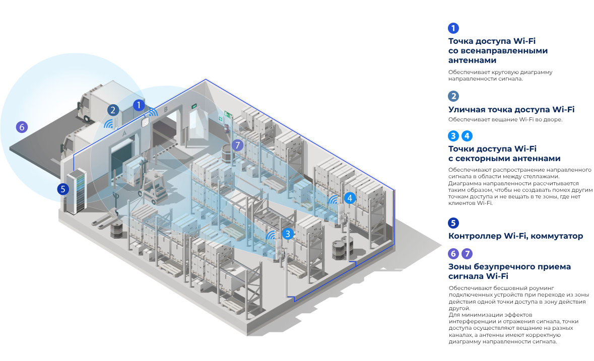 Wi-Fi на складах - инфраструктурный сервис, обеспечивающий беспроводную связь для терминалов сбора данных (ТСД), телефонов, терминалов RFID, беспроводных сенсоров и датчиков, компонентов систем видеонаблюдения, автопогрузчиков и т. д. Современная специфика работы склада предусматривает постоянное движение грузов, до нескольких десятков тысяч перемещений в сутки. Автоматизация и беспроводная связь в таких условиях - элементы первой необходимости для бизнеса, позволяющие создать интегрированную систему управления складом и контролировать его в режиме реального времени. Автоматизированный склад обеспечивает экспоненциальное увеличение количества обработанных в единицу времени заказов, минимизирует время пребывания товара на складе и практически исключает потерю или порчу продукции. Для сотрудников склада бесшовная сеть Wi-Fi обеспечивает возможность пользоваться корпоративным IP-телефоном, портативным принтером, сканером RFID, терминалом, на который поступают задачи по сборке и транспортировке грузов, оставаясь при этом полностью мобильными.